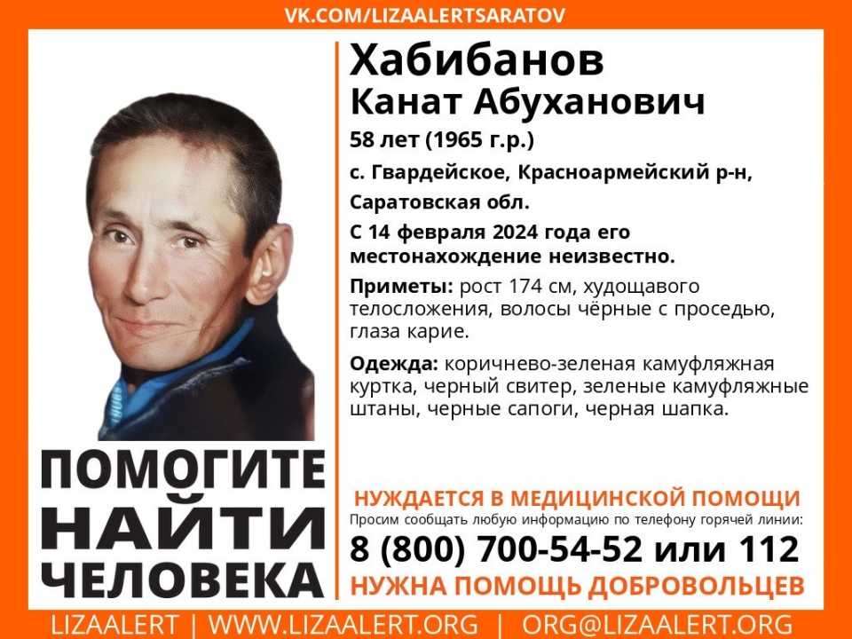 В Саратовской области ищут без вести пропавшего К аната Хабибанов а . Сегодня об этом сообщил поисковый отряд "Лиза Алерт Саратов".
