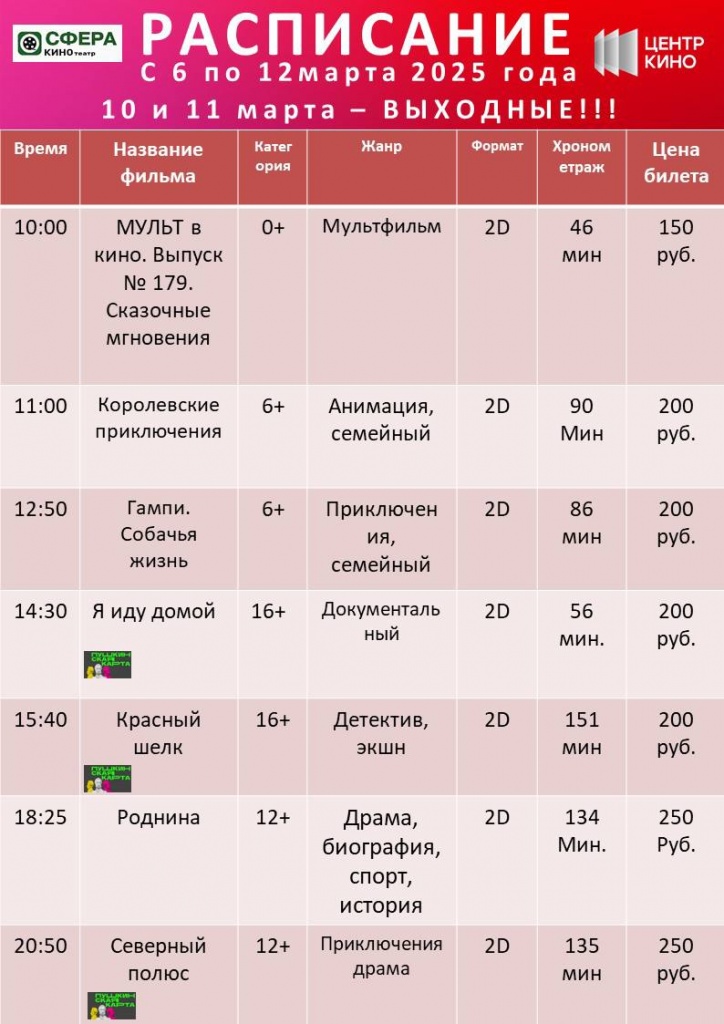 10 и 11 марта-выходные. Расписание единое и действует на все дни. Билеты уже в продаже на сайте https://center-kino.ru/ Виджет ВК https://vk.com/center_kino_rtishchevo В кассе кинотеатра.