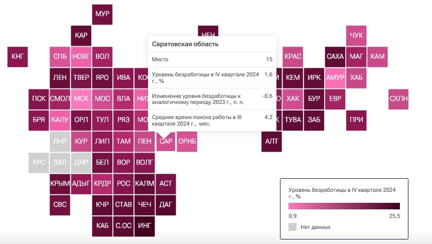 Саратовская область оказалась на 15-й строчке с уровнем безработицы в 1,6%; при этом в конце 2024-го ее уровень снизился к аналогичному периоду позапрошлого года на 0,6 п.п. (было 2,2%). Среднее время поиска работы для саратовцев также уменьшилось – с 5,2 до 4,2 месяца.