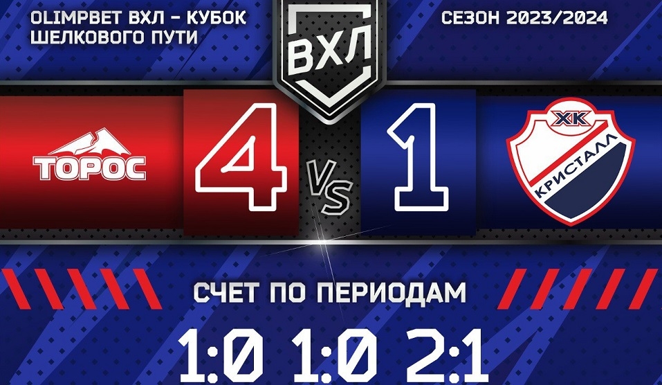 Трехкратный победитель Чемпионата ВХЛ открыл счет на 18-й минуте и выиграл первый период 1:0. За 1.15 до второго перерыва "Торос" отличился еще раз, на 41-й минуте забил дважды. Эти голы разделили 26 секунд.