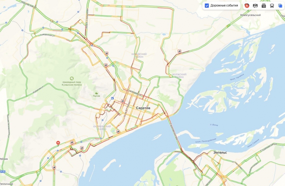 Дорожную ситуацию в Саратове сегодня утром сервис "Яндекс. Пробки" оценивает в 9 балов.