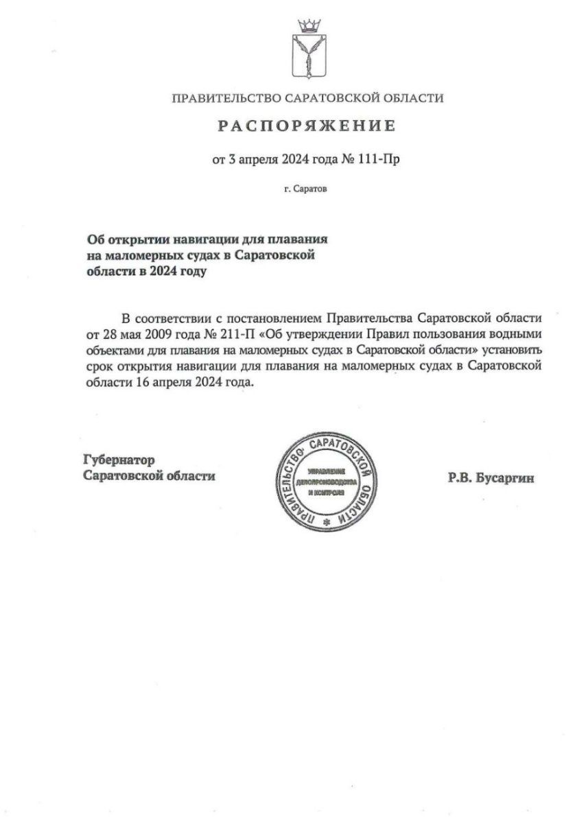 В 2024 году навигация для плавания на маломерных судах в Саратовской области откроется 16 апреля. Соответствующее распоряжение подписал сегодня губернатор Роман Бусаргин.
