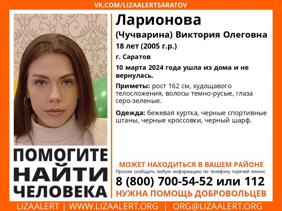 В Саратове ищут пропавшую без вести 18-летнюю Викторию Ларионову (Чучварину) .