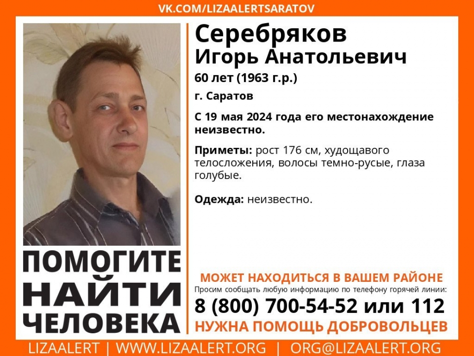 В Саратове пропал 60-летний Игорь Серебряков . Об этом сообщает поисковый отряд "Лиза Алерт Саратов".